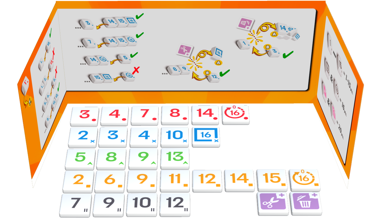 Tipp: Um das Spielen zu erleichtern, kannst du die Plättchen nach Farbe und Zahlenreihen sortieren.