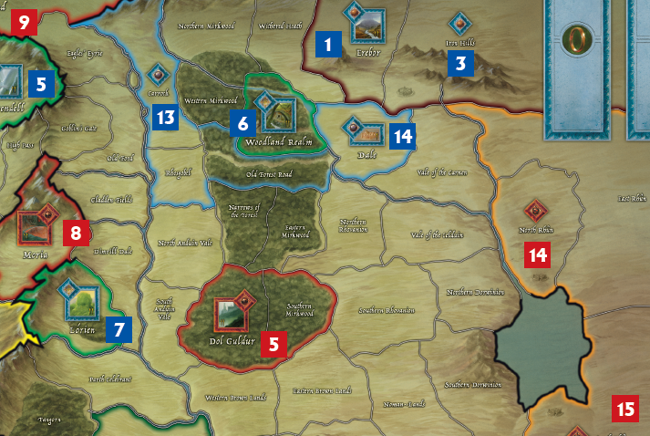 Elfos 4) Puertos Grises: 1 Regular, 1 Élite, 1 Líder. 5) Rivendel: 2 Élite, 1 Líder. 6) Reino del Bosque: 1 Regular, 1 Élite, 1 Líder. 7) Lórien: 1 Regular, 2 Élite, 1 Líder. Refuerzos: 2 Regular, 4 Élite.