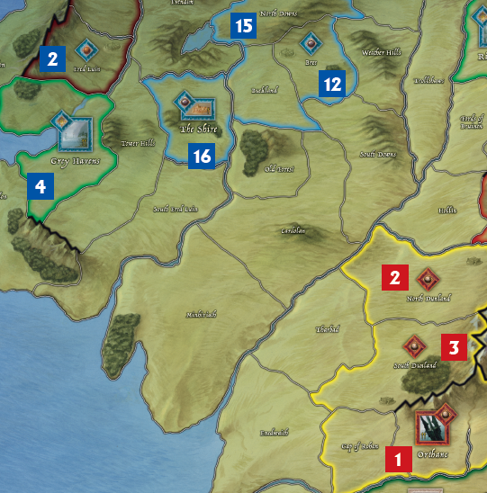 Gondor 8) Minas Tirith: 3 Regular, 1 Élite, 1 Líder. 9) Dol Amroth: 3 Regular. 10) Osgiliath: 2 Regular. 11) Pelargir: 1 Regular. Refuerzos: 6 Regular, 4 Élite, 3 Líder.