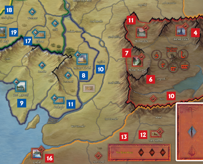 Sauron 4) Barad-Dûr: 4 Regular, 1 Élite, 1 Nazgûl. 5) Dol Guldur: 5 Regular, 1 Élite, 1 Nazgûl. 6) Gorgoroth 3 Regular. 7) Minas Morgul: 5 Regular, 1 Nazgûl. 8) Moria: 2 Regular. 9) Monte Gundabad: 2 Regular. 10) Nurn: 2 Regular. 11) Morannon: 5 Regular, 1 Nazgûl. Refuerzos: 8 Regular, 4 Élite, 4 Nazgûl.