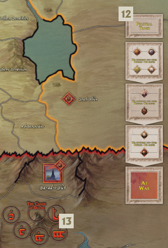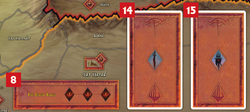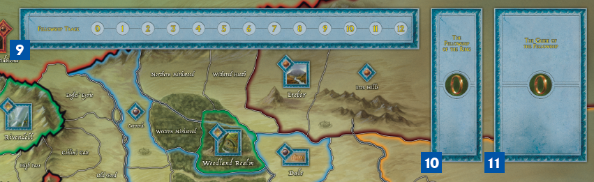 8. Casilla de Anillos Élficos (controlados por el jugador de la Sombra) 9. Marcador de Comunidad 10. Casilla de Comunidad del Anillo 11. Casilla de Guía de la Comunidad 12. Marcador Político 13. Marcador de Mordor 14. Casilla de Cartas de Evento de Personaje de la Sombra 15. Casilla de Cartas de Evento de Estrategia de la Sombra