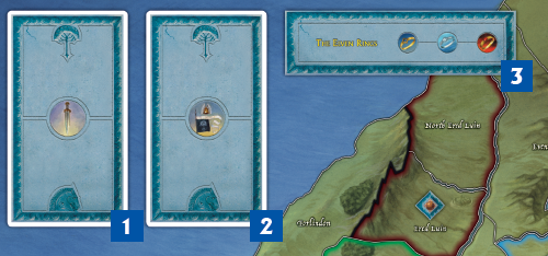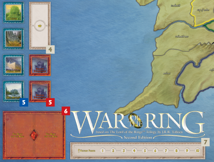 1. Casilla de Cartas de Evento de Personaje de los Pueblos Libres 2. Casilla de Cartas de Evento de Estrategia de los Pueblos Libres 3. Casilla de Anillos Élficos (controlados por el jugador de los Pueblos Libres)