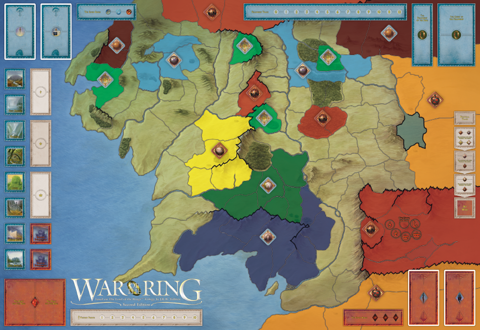 El tablero de juego representa la parte occidental de la Tierra Media a finales de la Tercera Edad. Además del área de juego en sí misma, el tablero de juego también incluye varias casillas y marcadores que se usan para ayudar a los jugadores a llevar el control de los diferentes elementos y componentes del juego.