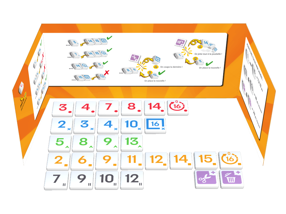 Conseil : vous pouvez trier vos tuiles par couleur et par valeur et placer vos éventuelles tuiles Ciseaux et Poubelle à distance des autres tuiles.