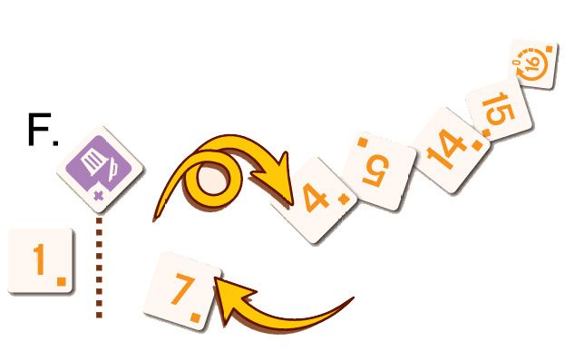 F. Flo joue la tuile Poubelle pour retirer toutes les tuiles de la rangée orange sauf le 1. Elle choisit ensuite de continuer son tour et doit donc placer une ou plusieurs tuiles à la suite de la rangée orange. Elle joue le 7 orange.