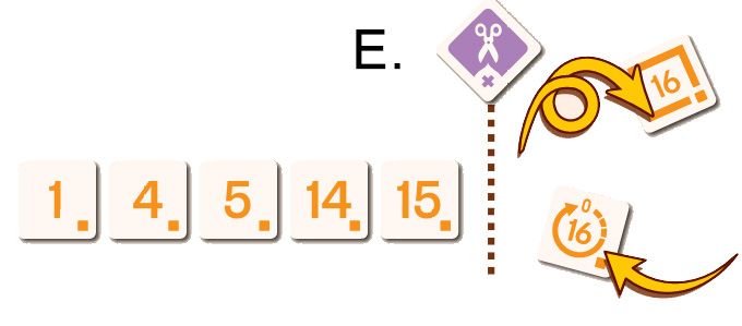 E. Max joue la tuile Ciseaux et retire la dernière tuile de la rangée orange. Il décide ensuite de continuer son tour et joue la tuile Redémarrage orange. Il annonce : "Redémarrage !"