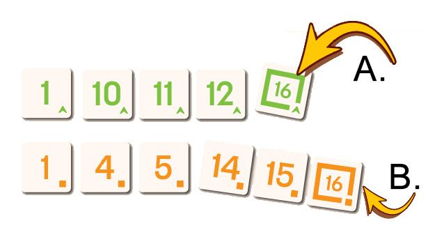 Tuile Fin : Se joue seule ou en dernière tuile d'une suite. C'est un 16, ce qui clôture automatiquement la rangée : aucun joueur ne peut plus placer de tuiles numérotées après celle-ci, mais elle peut être retirée par une tuile Ciseaux ou une tuile Poubelle.