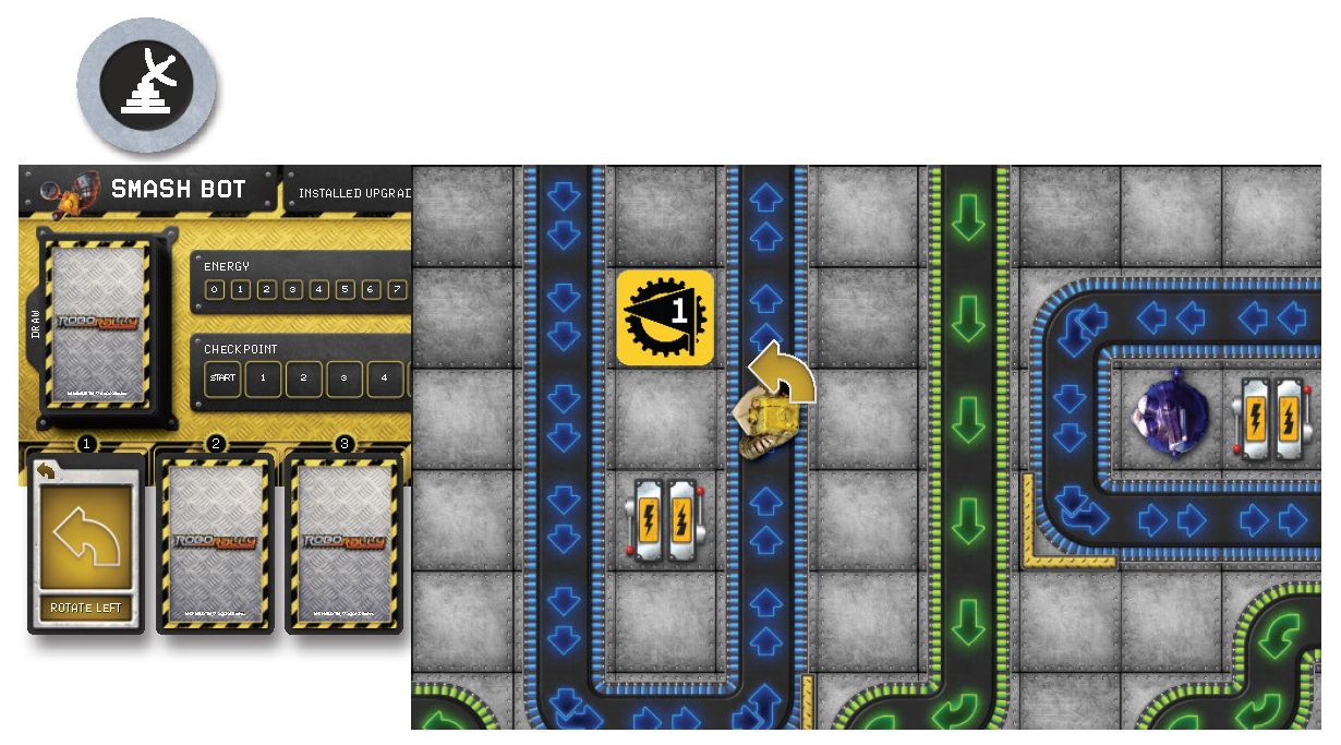 2. The player with priority (that is, the player who holds the Priority Token) carries out the action on their Register 1 card. Don’t worry about any effects of the space your robot stops on just yet.