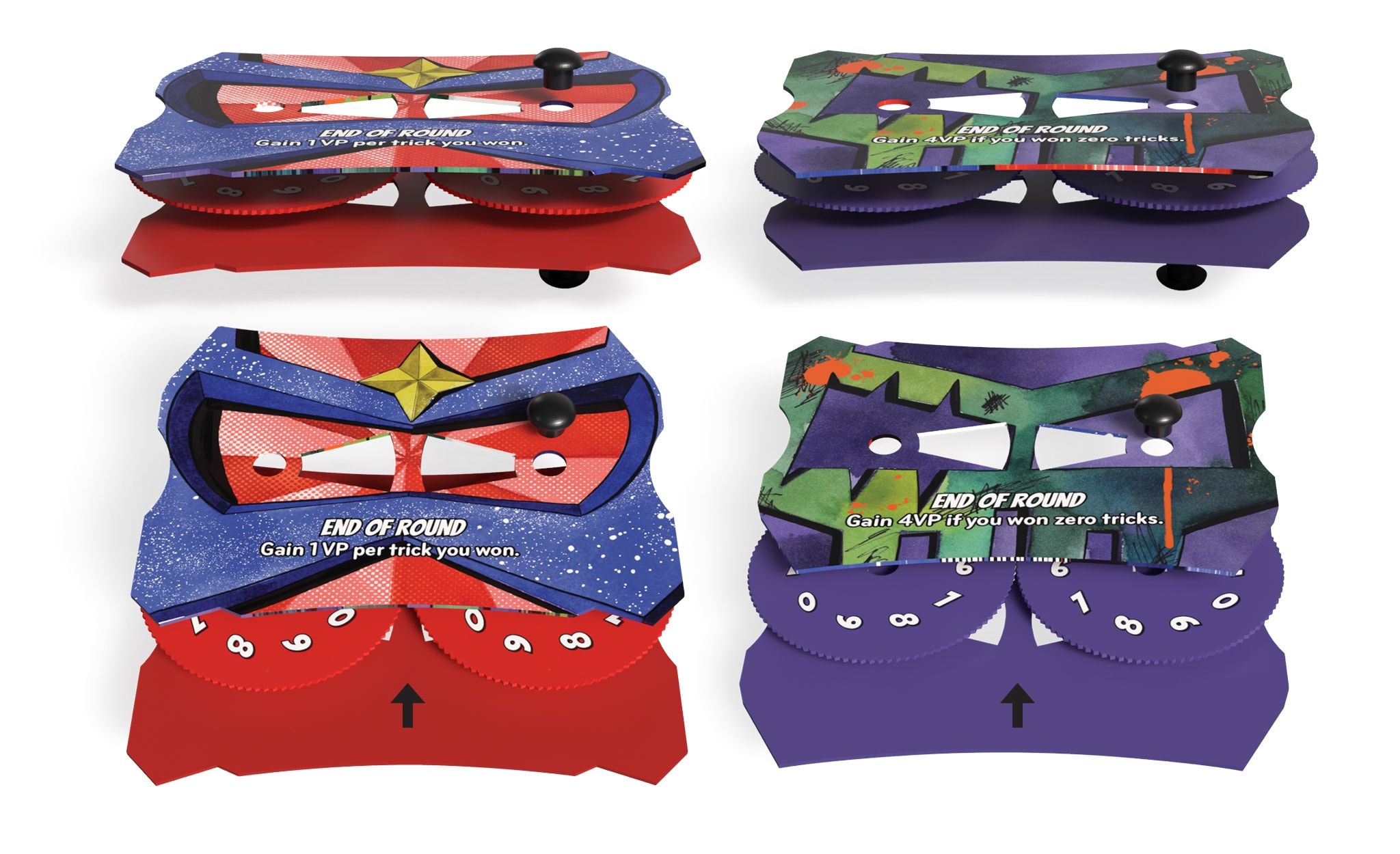 Sandwich one left and one right wheel between two masks using the provided rivets. One side should show the red “hero” side and the other side should show the purple “villain” side.