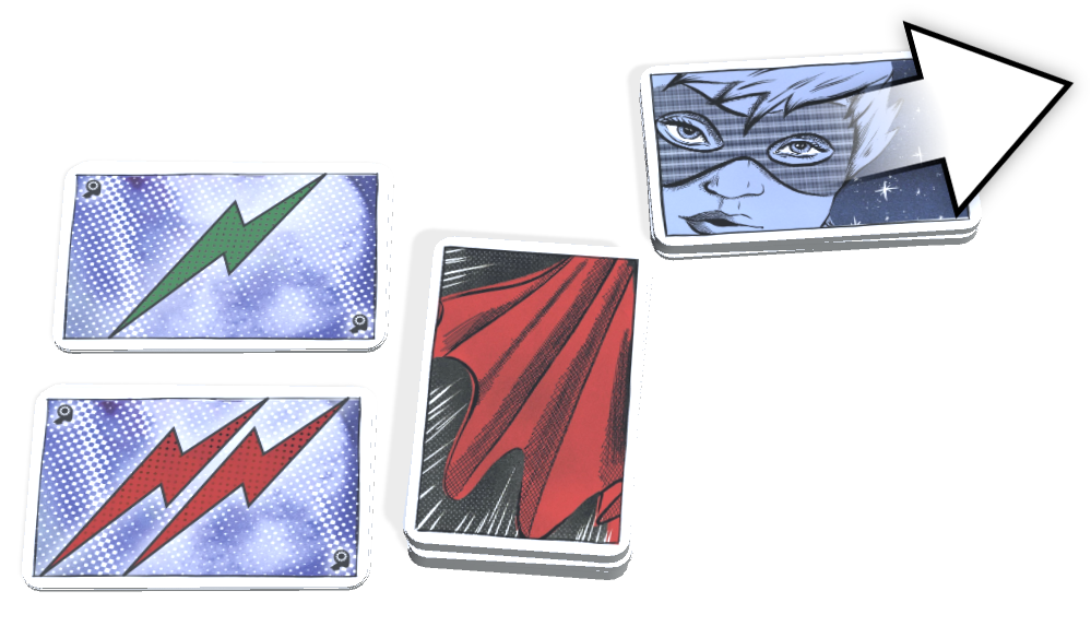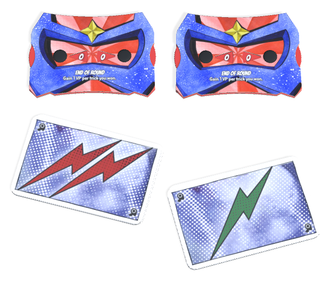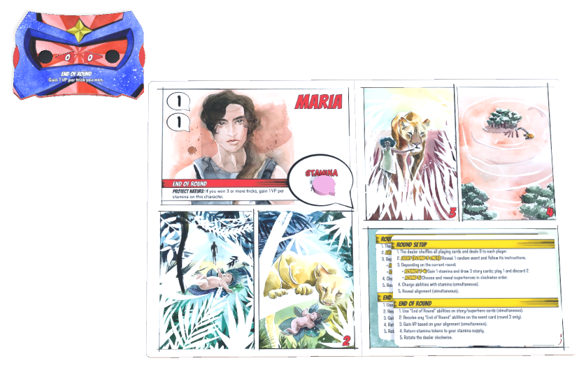 d. Gain 2 random superhero cards. Look at them and place them face down on the superhero space of your player mat (you will choose 1 later in round 5). Return unused superhero cards to the box.