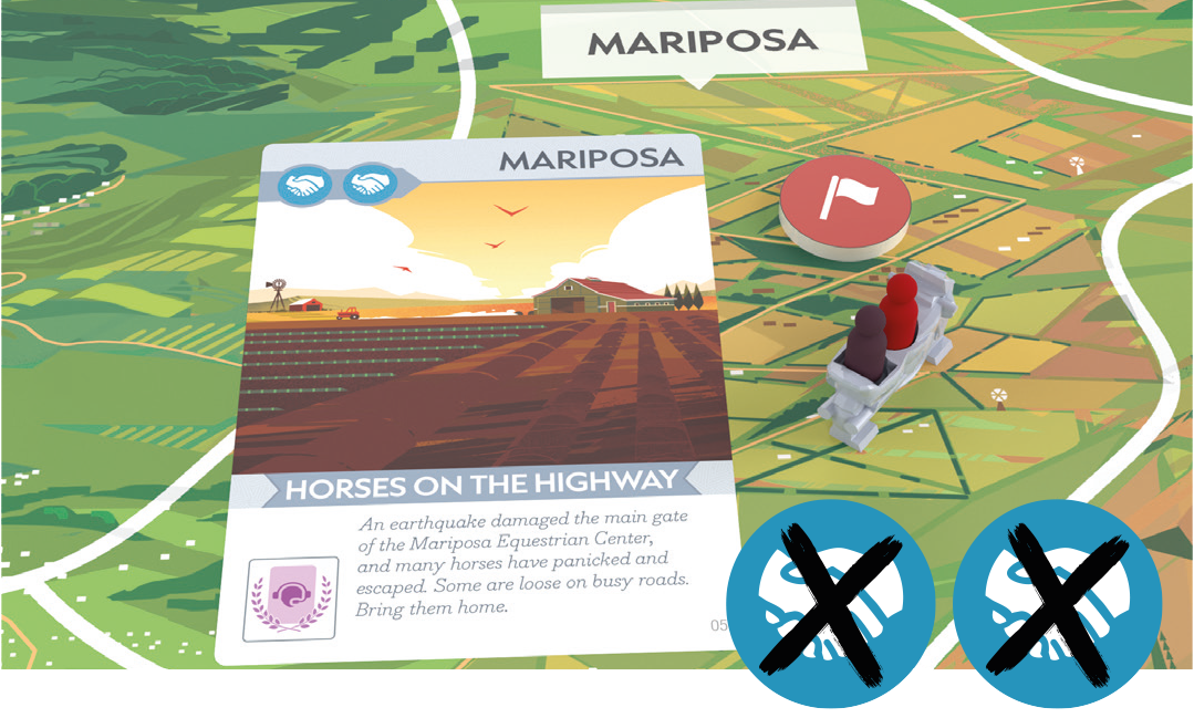 Example 1: The Firefighter () moves the motorcycle to Mariposa. Then the Rope Rescuer (