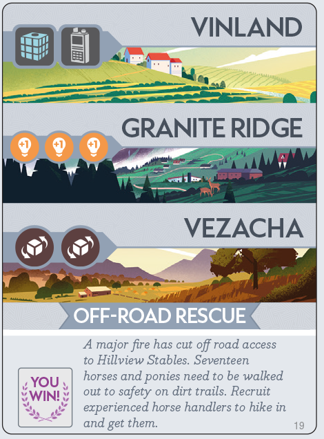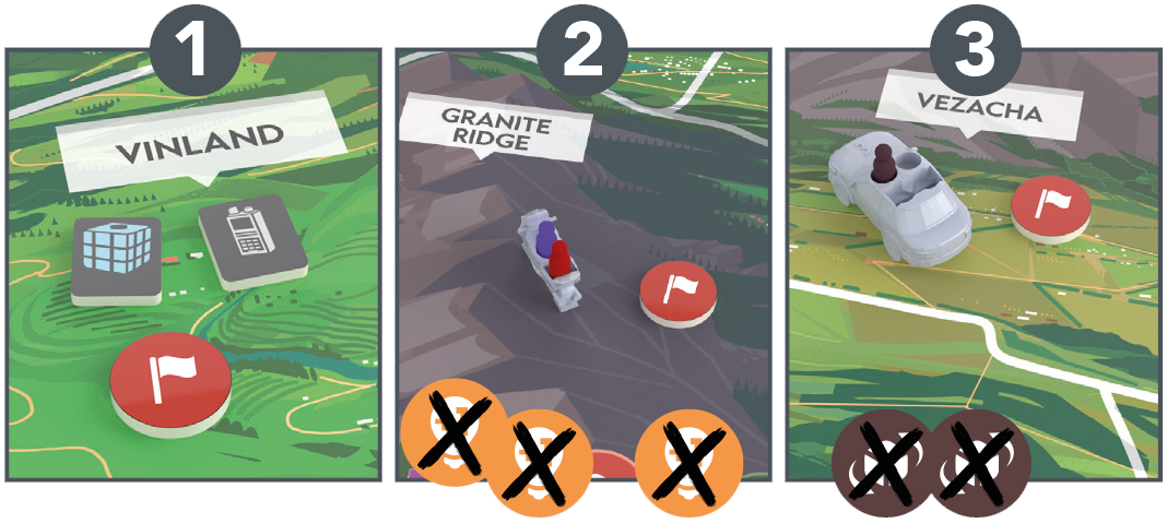 Tip: You can place the mission tokens () onto the board to help you remember the location (or locations) listed on your next mission. Reset their locations each time you get a new mission.