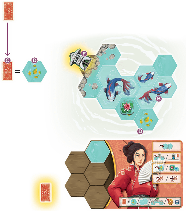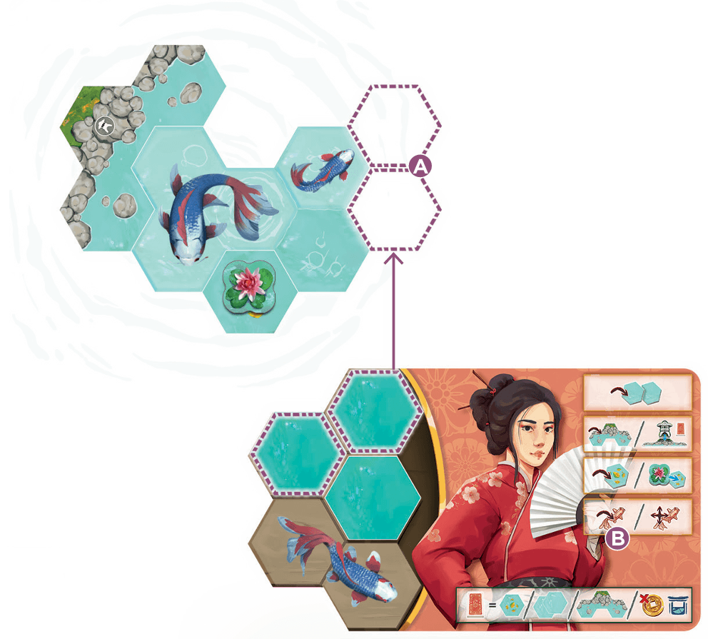 Then, he decides to use his Sensei action B to place the medium koi, using 1 of the 2 water tiles just placed (see below)