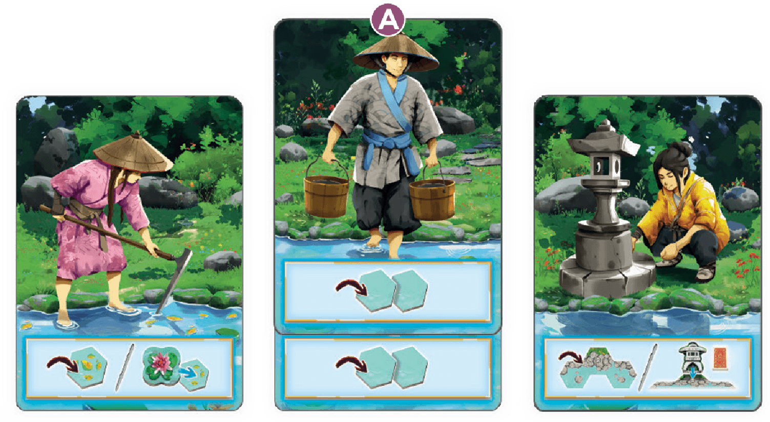 Among the Helper cards at his disposal, he decides to use the Porter card A to place 2 water tiles.