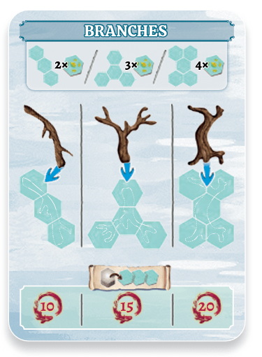 Each branch must be placed on top of the water hexes that match the requirement. Additionally, you can take up to 3 water tiles from the supply and place them in your pond immediately.