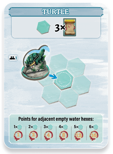 1/2/4/8/12/16 VP at the end of the game if there are 1/2/3/4/5/6 empty water tiles adjacent to the turtle.