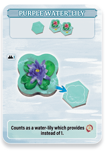 The purple water-lily counts as a water-lily which increases the value of each koi adjacent to it by 2 VP instead of 1. These points are doubled as usual for surrounded koi.