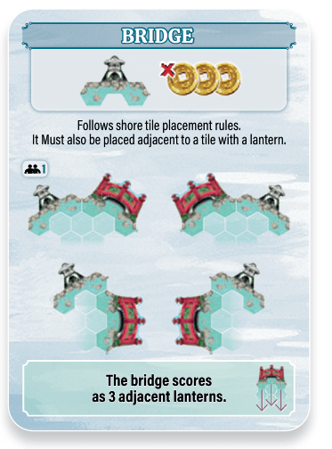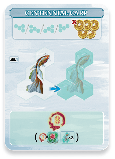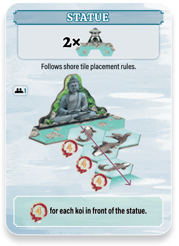 Have an empty water hex. When you place a koi in your pond, you may pay 2 coins to also take and place 1 path tile.