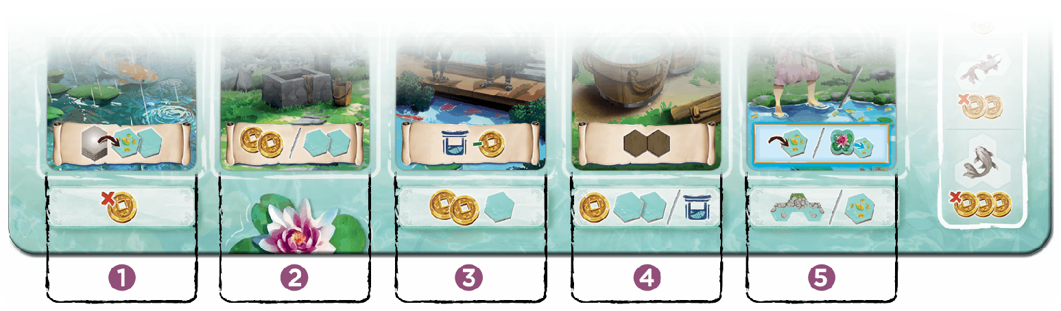 1. When you meditate, if you choose the fourth space on the main board, you may purchase 1 koi for the normal price, instead of taking a coin and 2 water tiles.