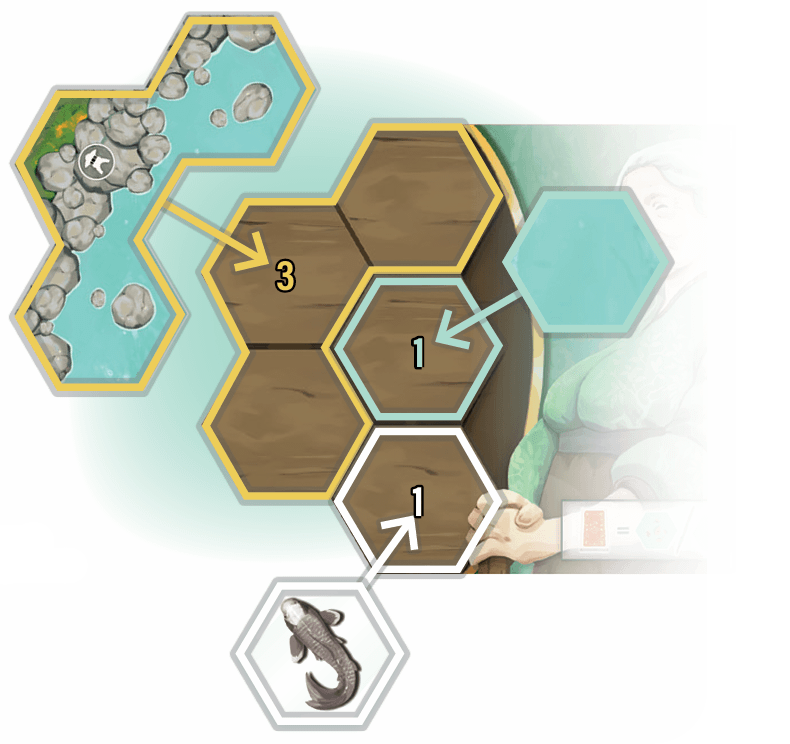 In the rare cases where it’s not possible to neatly fit tiles into your storage, compare the total number of hexes on your tiles with the available space in your storage to ensure your capacity limit is still respected.