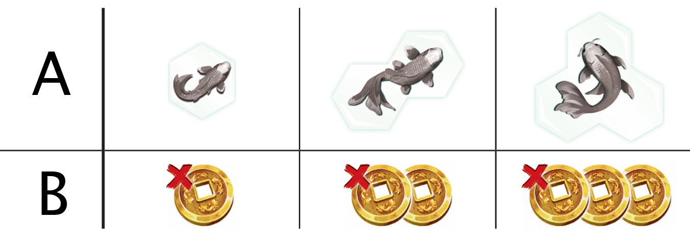 3. By discarding 1 luck token you own, you may purchase 1 koi for 1 coin more than the normal price. The base price of a koi depends on its size: