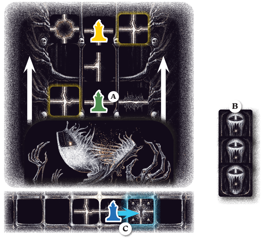 Green can be forced out of the Hollow if the Other advances, they will also take a tile penalty and go Lights Out. If 3 Shrieks are drawn (B), Yellow and Green will be ejected from the Hollow. Yellow will not take any penalties from this, but Green will suffer a tile penalty and go lights out. If Blue, who is on the Main Board, moves onto the Watched Key tile then Yellow and Green will be ejected from the Hollow (C).