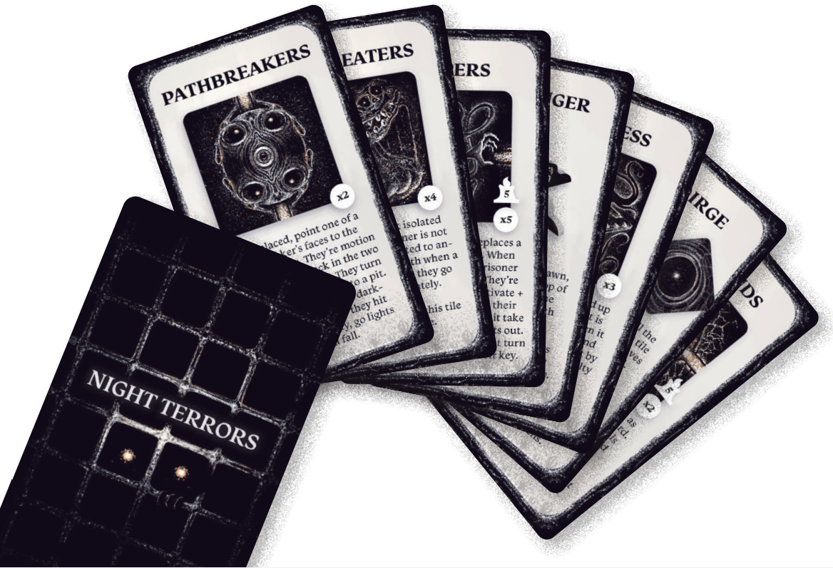 Some groups may prefer to choose their Bosses. For groups that prefer chaos, Night Terror cards are included for ease of reference and randomization. Simply shuffle and draw a number of cards according to the level of difficulty you desire.
