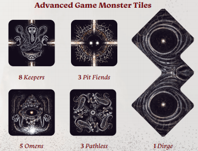 Organize all the tiles by type and remove the following tiles, which are only used in the Advanced game or to adjust the difficulty of the game: 7 Keepers, 3 Pit Fiends, 3 Pathless, 5 Omens, 1 Wax Eater, 1 Key tile and 2 Crumbling T Passages. Place them back into the box, as they will not be needed for the standard game.