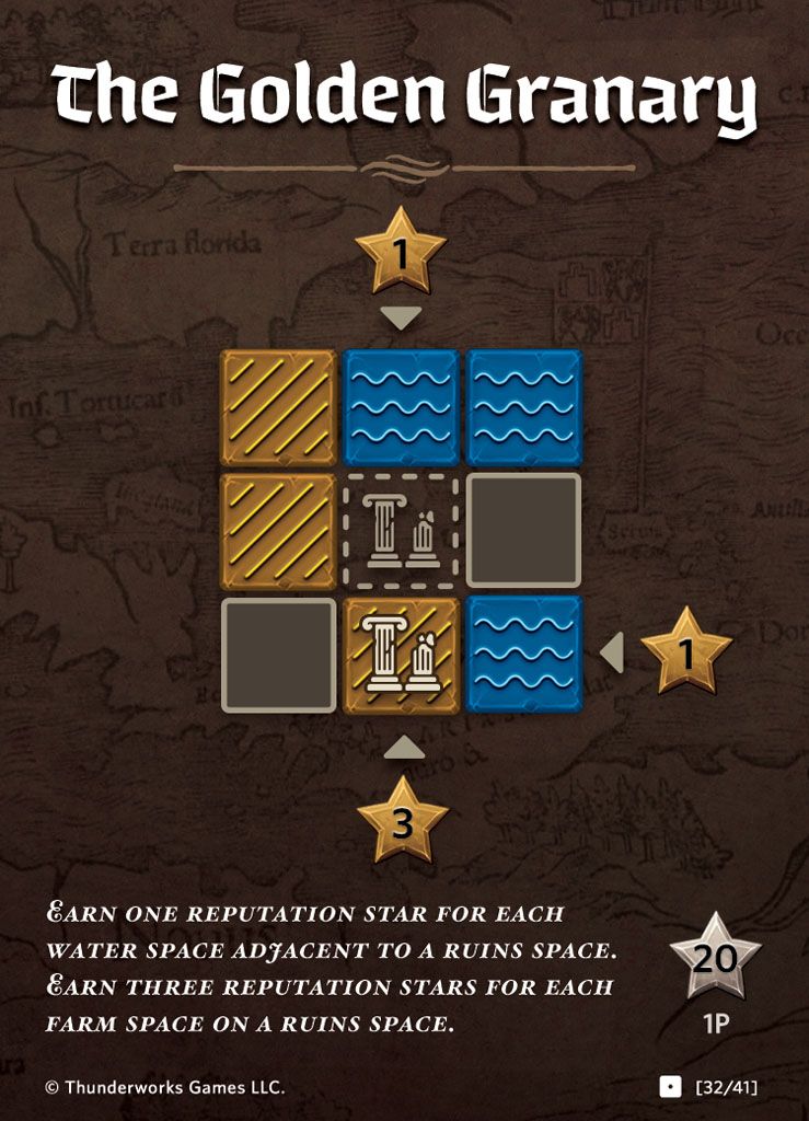 Earn 1 reputation for each Water space adjacent to a Ruins space.