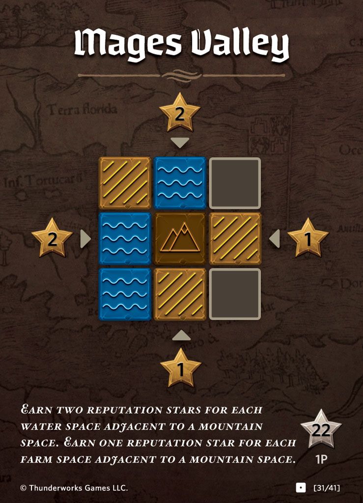 Earn 2 reputation for each Water space adjacent to a Mountain space.