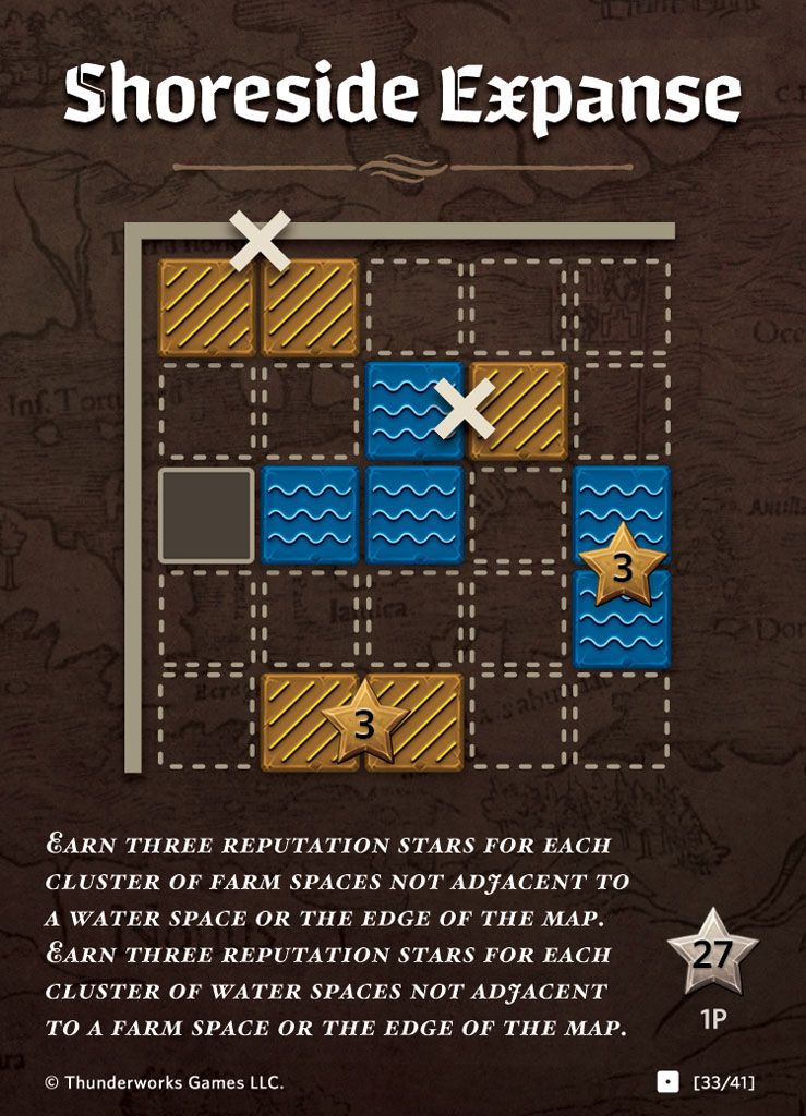 Earn 3 reputation for each cluster of Water spaces not adjacent to a Farm space OR the edge of the Map.